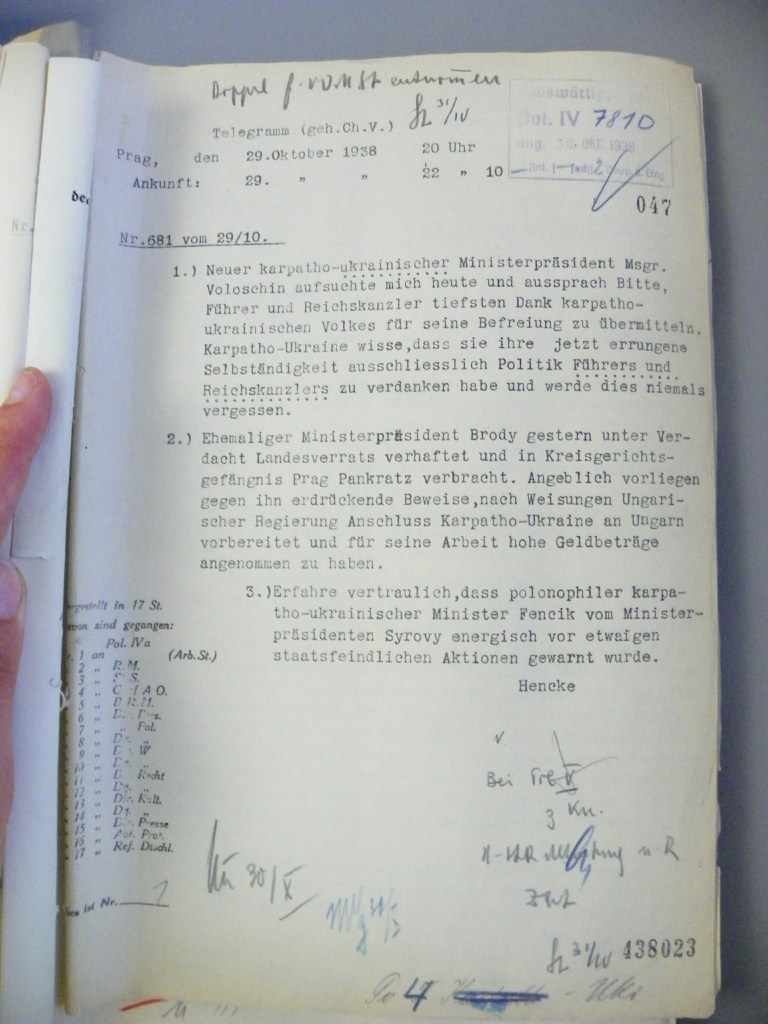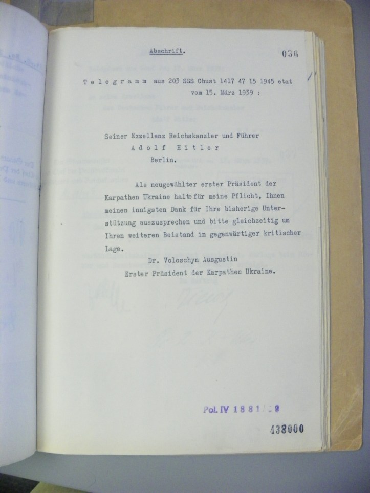 1). Новый карпато-украинский премьер-министр монсеньёре Волошин сегодня посетил меня и высказал просьбу передать фюреру и рейхсканцлеру глубокую благодарность карпато-украинского народа за его освобождение. Карпато- Украина знает, что за достигнутую ею теперь независимость, она должна благодарить исключительно фюрера и рейхсканцлера и, она этого никогда не забудет.