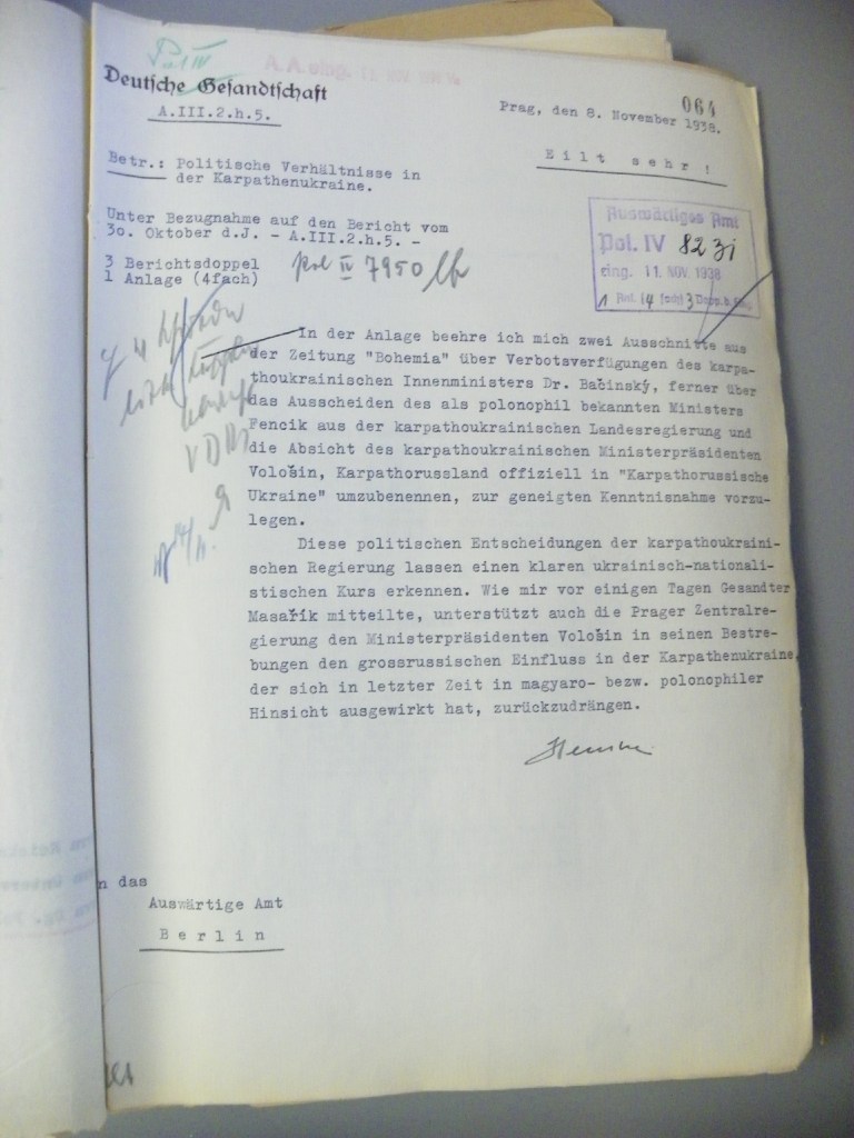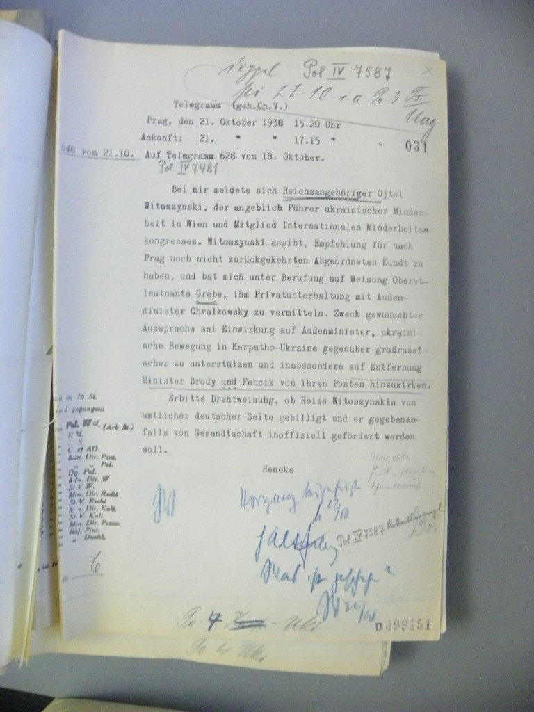 Со мной связался гражданин Рейха Ойтол Витошински, который якобы является лидером украинского меньшинства в Вене и членом Международного конгресса меньшинств. Витошинский заявил, что имеет рекомендацию еще невернувшемуся в Прагу, депутату Кундту, и попросил меня со ссылкой на распоряжение подполковника Гребе, посредничать в частной беседе с министром иностранных дел Хвалковским. Цель желаемого обсуждения состоит в том, чтобы оказать влияние на министра иностранных дел с тем, чтобы поддержать украинское движение в Карпатской Украине по отношению к велико- русскому и, в частности, содействовать удалению министров Броди и Фенцика с их постов.