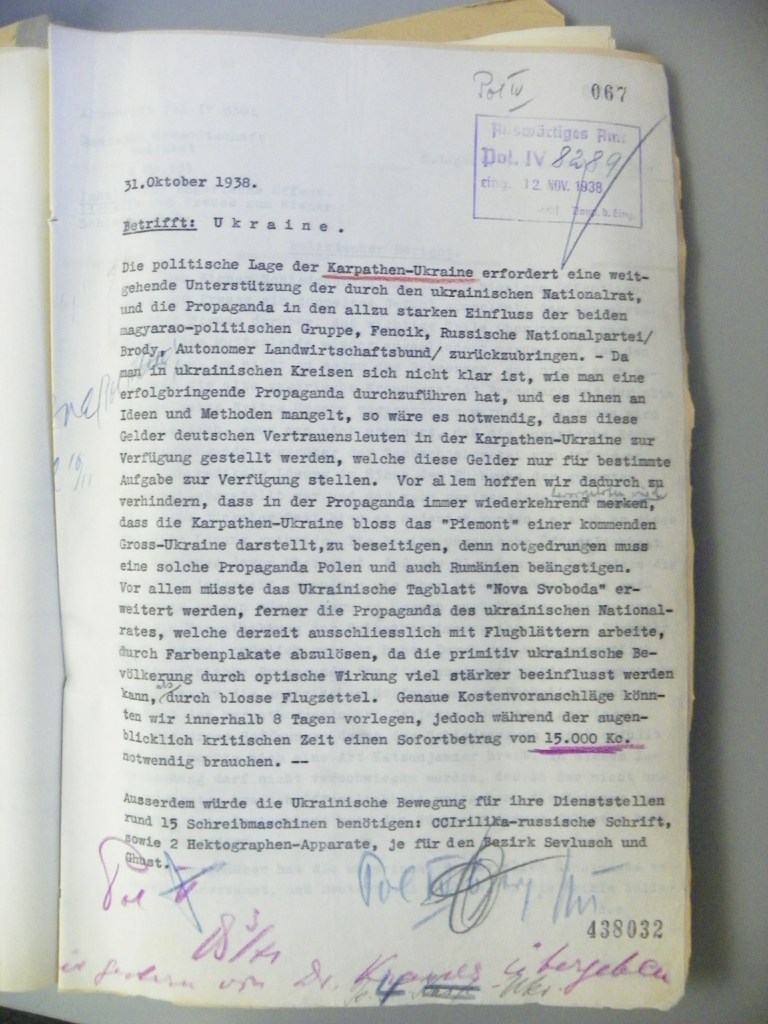 Политическая ситуация в Карпато- Украине требует вернуть широкую поддержку украинскому национальному совету – Сойму, а также ввиду слишком сильного влияния двух мадьярских политических групп, Фенцика – российской национальной партии / Броди – автономного Сельскохозяйственного союза. – Поскольку украинским кругам неясно, как провести успешную пропаганду, и им не хватает идей и методов, то было бы необходимо, чтобы эти средства были предоставлены немецким доверенным лицам в Карпатской Украине, которые выделяли бы эти средства только для выполнения определенных задач. Прежде всего, мы надеемся тем самым устранить наблюдаемое нами, постоянно повторяющееся акцентирование пропаганды на том, что Карпатская Украина представляет собой просто „Пьемонт“ грядущей Великой Украины, ибо неизбежно, что такая пропаганда должна пугать Польшу и Румынию.