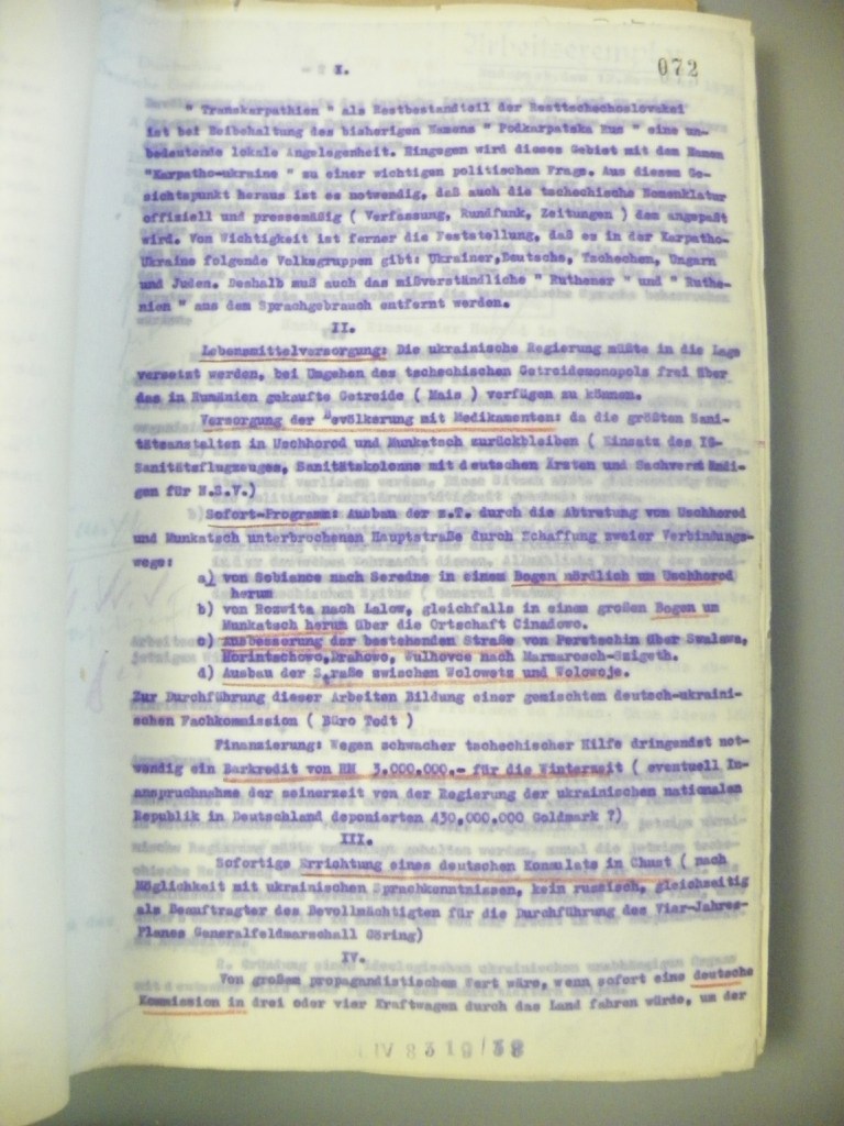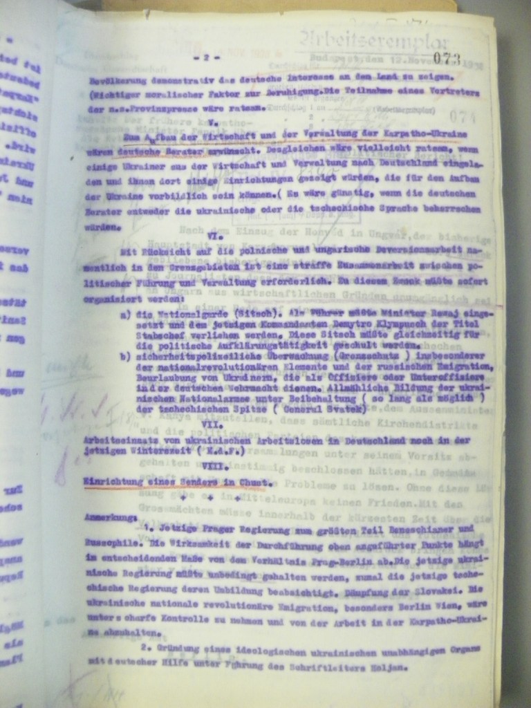 1. Нынешнее пражское правительство по большей части бенешианцы и русофилы. Эффективность реализации вышеуказанных пунктов в решающей степени зависит от отношений между Прагой и Берлином. Нынешнее украинское правительство должно быть обязательно сохранено, тем более что нынешнее чешское правительство намерено переформироваться. Демпфирование Словакии. Украинскую национальную революционную эмиграцию, особенно ось Берлин — Вена, следовало бы взять под строгий контроль и отстранить от работы в Карпатской Украине.